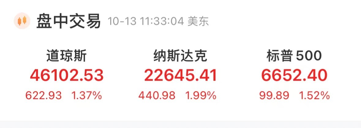 当地时间周一(10月13日),美股三大指数集体高开,截至发稿,涨幅扩大,道指涨1.37%,纳指涨1.99%,标普500指数涨1.52%。