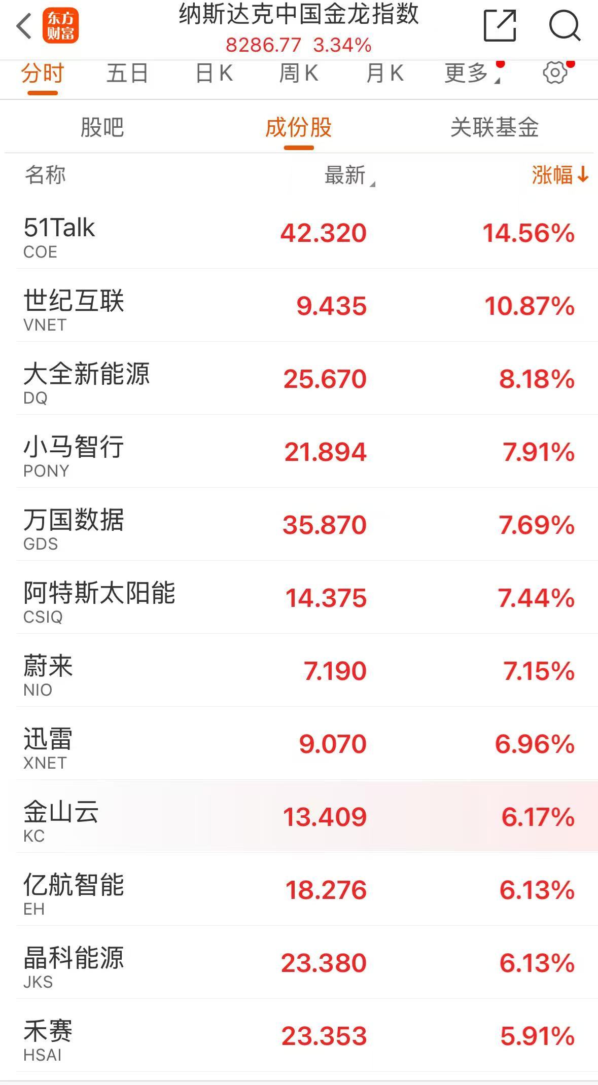 值得注意的是,热门中概股涨幅不断扩大,截至发稿纳斯达克中国金龙指数涨超3%。51Talk涨14.56%,世纪互联涨10.87%,阿里巴巴、百度、拼多多、京东等热门中概股也都跟涨。