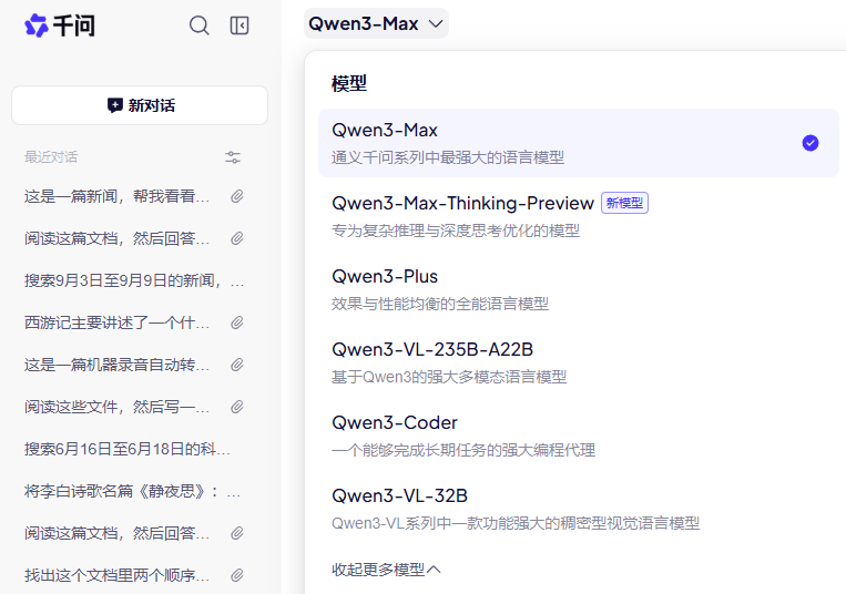 千问在对话中可以选择的模型类别。 图/千问PC端截图