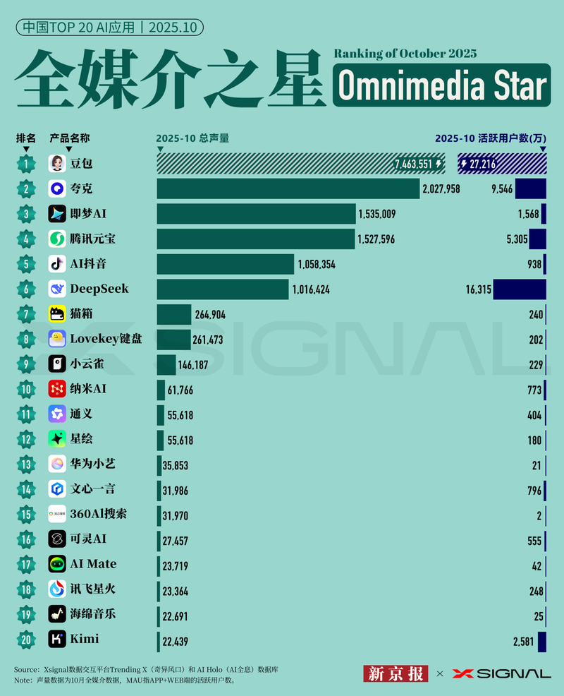 新京报联合Xsignal发布的10月“全媒介之星”中国AI应用榜,阿里旗下的夸克月活数据排名第三,而声量数据排名第二。