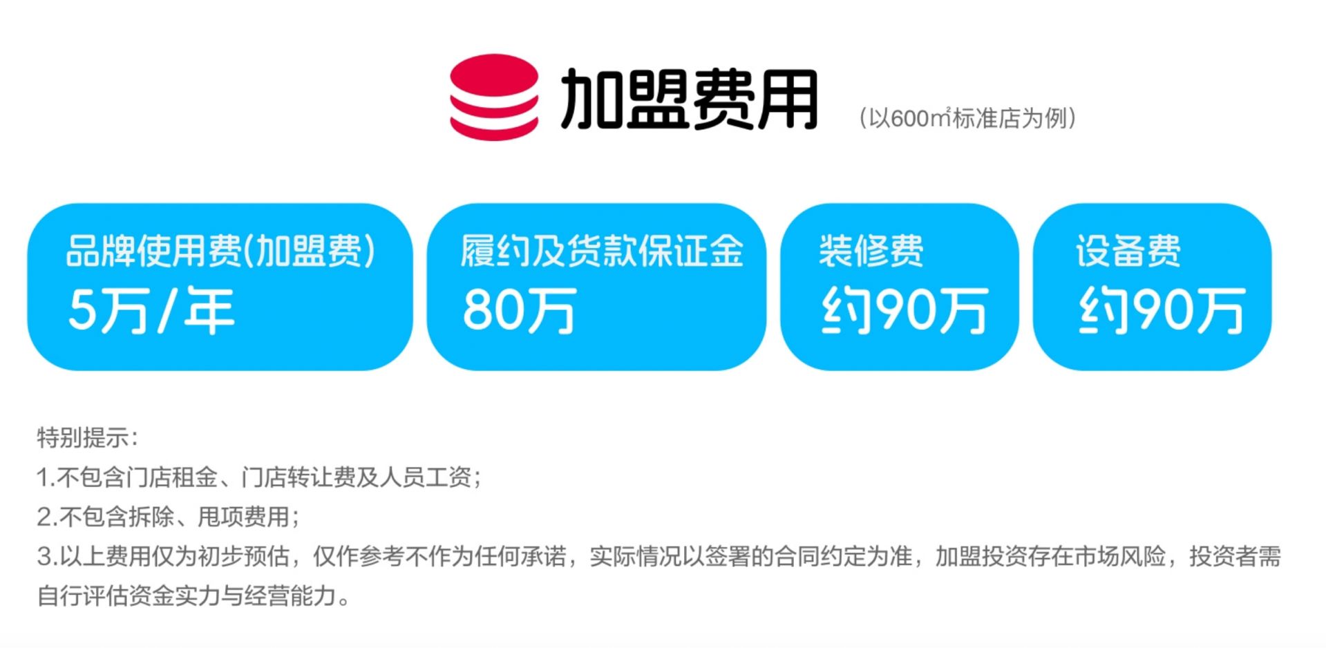 《每日经济新闻》记者在超盒算NB的官网看到,以600平方米的标准店为例,加盟费用除了5万元每年的品牌使用费(加盟费)之外,还包括80万元的履约及货款保证金、约90万元的装修费和约90万元的设备费,累计265万元。此外,加盟商还需要承担门店租金、门店转让费及人员工资等费用。