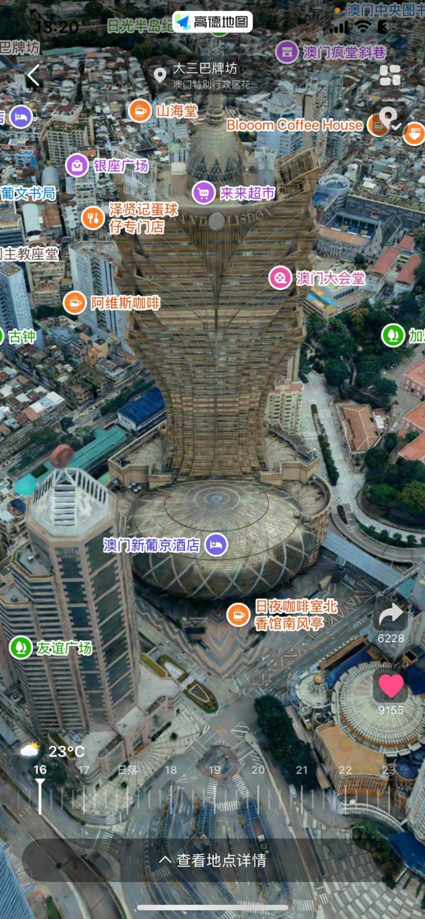 在出发前,游客可通过“一键智慧游澳门”中的奇境Max,在手机上以360度视角沉浸式鸟瞰澳门特区全貌。在空间智能技术的加持下,高德为澳门全域建立了生动逼真、美轮美奂的数字孪生模型。大三巴的古朴、澳门塔的开阔,酒店和官也街之间的距离远近,都可以在奇境Max中直观地看到,方便游客的出行和决策。
