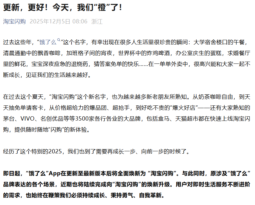 据淘宝闪购12月5日消息,即日起,“饿了么”App在更新至最新版本后将全面焕新为 “淘宝闪购”。与此同时,原涉及“饿了么”品牌表达的各个场景,近期也将陆续完成向“淘宝闪购”的焕新升级。