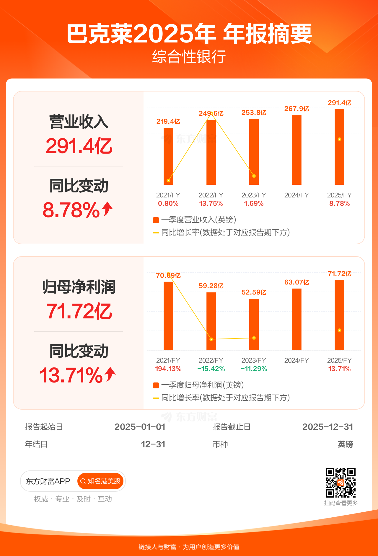 巴克莱2月10日发布年报业绩,截至2025年12月31日的12个月内,该公司营业收入291.40亿英镑,同比增长8.78%;公司权益持有人应占溢利(归母净利润)71.72亿英镑,同比增长13.71%。