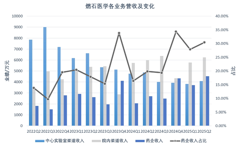 同自2022年,除检测老本行外,燃石医学也加速推进药企合作业务,赚药企的钱。2025年第二季度,该部分营收一路增至4520万元,同比增长68.1%,在公司总收入中的占比攀升到超30%。