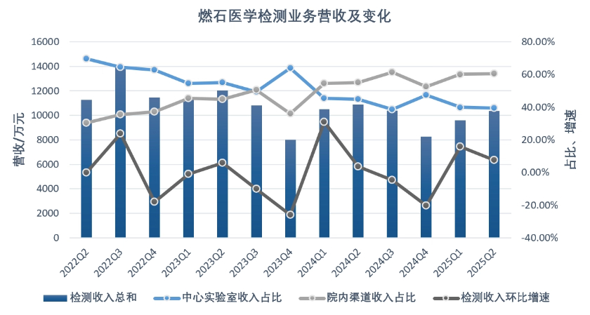 三年前,公司院内和中心实验室收入比约为3:7,到2025年第二季度,该比例已调整为6:4,收入分别为6250万元、4090万元,分别同比变动4.4%、-16.2%。但需要注意的是,其检测业务总收入规模实际上止步不前。