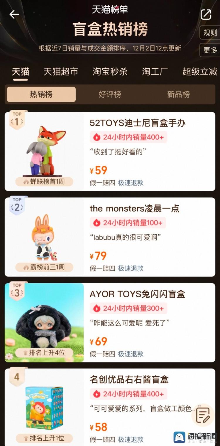 天猫平台盲盒热销榜中,《疯狂动物城2》的相关联名盲盒蝉联“热销榜”榜首1周。