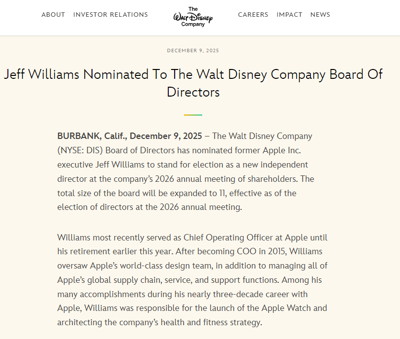 上证报中国证券网讯华特迪士尼公司当地时间12月9日公告称,董事会提名苹果公司前首席运营官(COO)杰夫·威廉姆斯(Jeff Williams)担任新的独立董事。他将在于2026年举行的年度股东大会上接受选举。若当选,迪士尼董事会成员将增至11人。