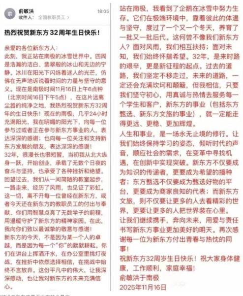 11月16日,新东方迎来成立32周年纪念日。作为创始人的俞敏洪身处南极发布内部信,向全体员工及支持者致谢。他借南极企鹅在极端环境中相互扶持、努力生存,类比新东方人面对困境时的团结与希望,回顾了新东方从北大一间简陋教室起步,历经风雨的创业历程,鼓励员工坚守初心,服务好学生与客户,展望未来事业的发展。