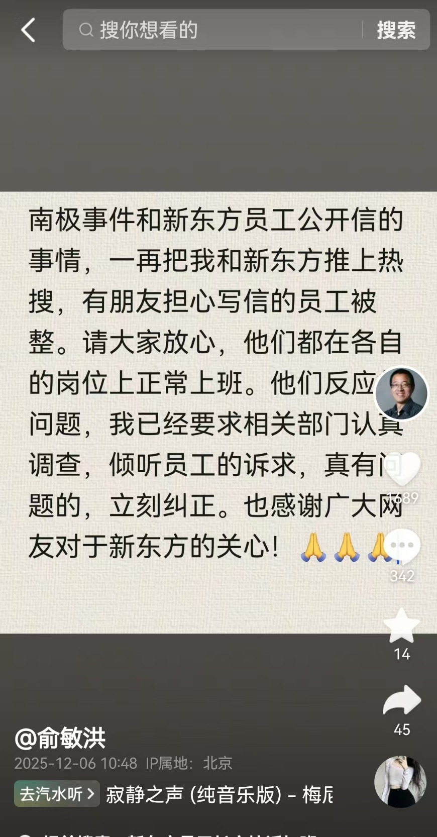 12月6日,新东方集团董事长俞敏洪发文称,南极事件和新东方员工公开信的事情,一再把我和新东方推上热搜,有朋友担心写信的员工被整。请大家放心,他们都在各自的岗位上正常上班。他们反映的问题,我已经要求相关部门认真调查,倾听员工的诉求,真有问题的,立刻纠正。