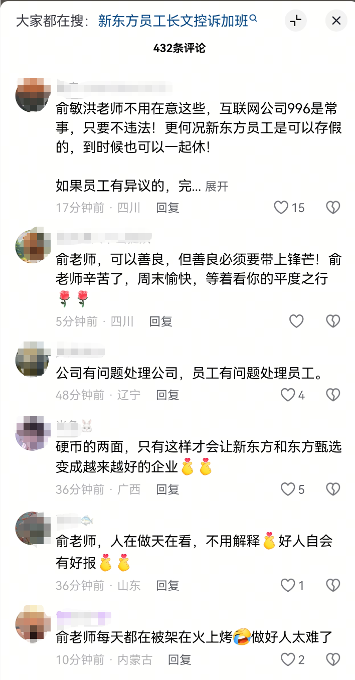 对于俞敏洪此次发声,有抖音网友表示,“互联网公司‘996’是常事,只要不违法”“公司有问题处理公司,员工有问题处理员工”“做好人太难了”。