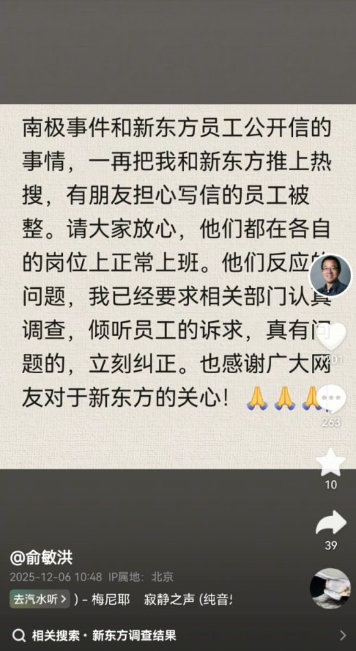 12月6日,新东方创始人俞敏洪发文称:“南极事件和新东方员工公开信的事情,一再把我和新东方推上热搜,有朋友担心写信的员工被整。请大家放心,他们都在各自的岗位上正常上班。他们反映的问题,我已经要求相关部门认真调查,倾听员工的诉求,真有问题的,立刻纠正。也感谢广大网友对新东方的关心!”