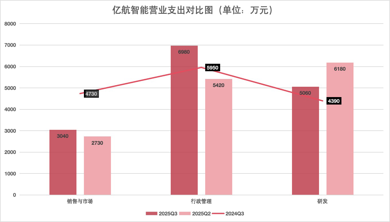 亿航智能在2025年第三季度(Q3)、第二季度(Q2)与2024年同期(Q3)在销售与市场、行政管理、研发三项主要业务支出上的对比变化(制图:陈怡轩)