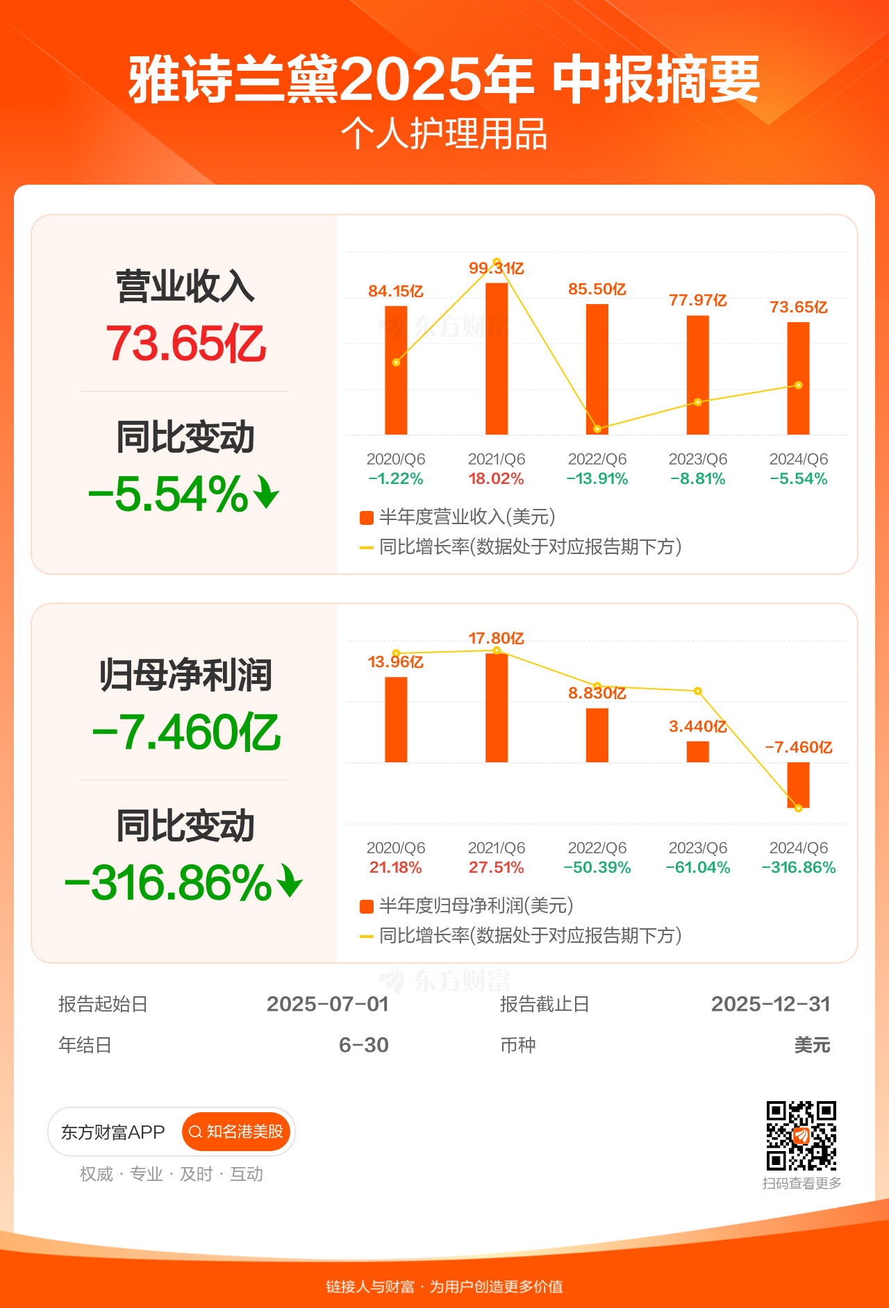 图解财报:雅诗兰黛中报盈利2.09亿美元,上年同期亏损7.46亿美元