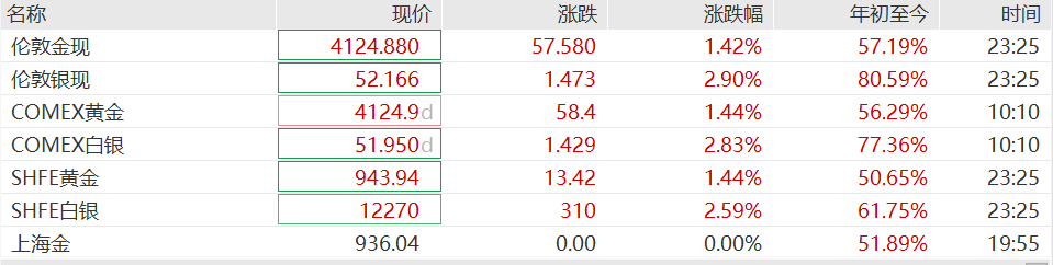 大宗商品方面,贵金属与石油表现出相反行情,贵金属方面,截至发稿,伦敦金现大涨1.42%报4124.88美元/盎司,伦敦银现涨2.9%报52.166美元/盎司。