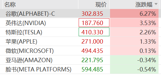 美股科技股普涨,万得美股科技七巨头指数涨超2%。谷歌涨超6%,消息面上,据财联社消息,谷歌发布的最新大模型Gemini 3 Pro登顶“大模型竞技场”LMArena排行榜榜首。