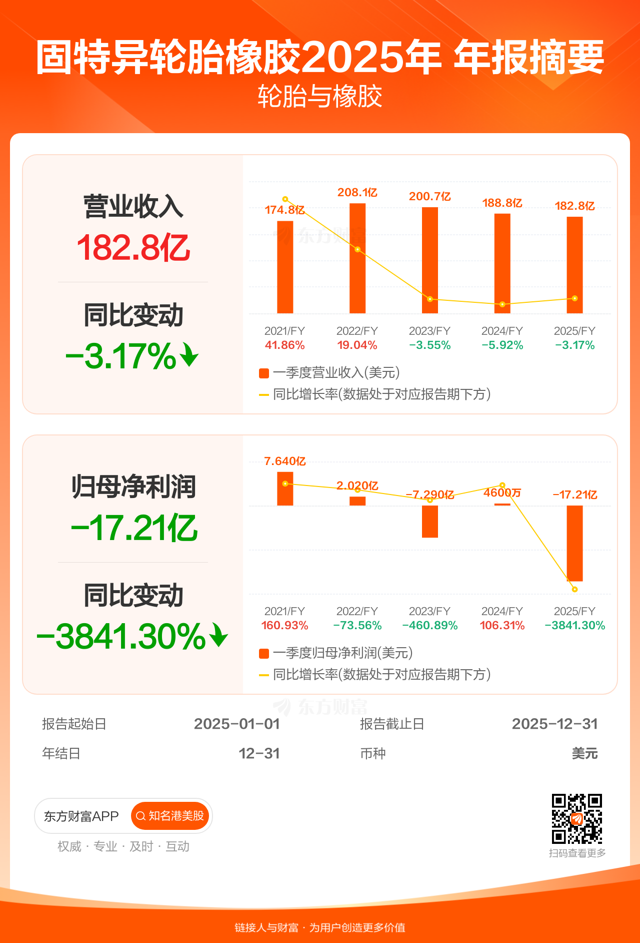 固特异轮胎橡胶2月9日发布年报业绩,截至2025年12月31日的12个月内,该公司营业收入182.80亿美元,同比减少3.17%;公司权益持有人应占溢利(归母净利润)-17.21亿美元,上年同期4600.00万美元。