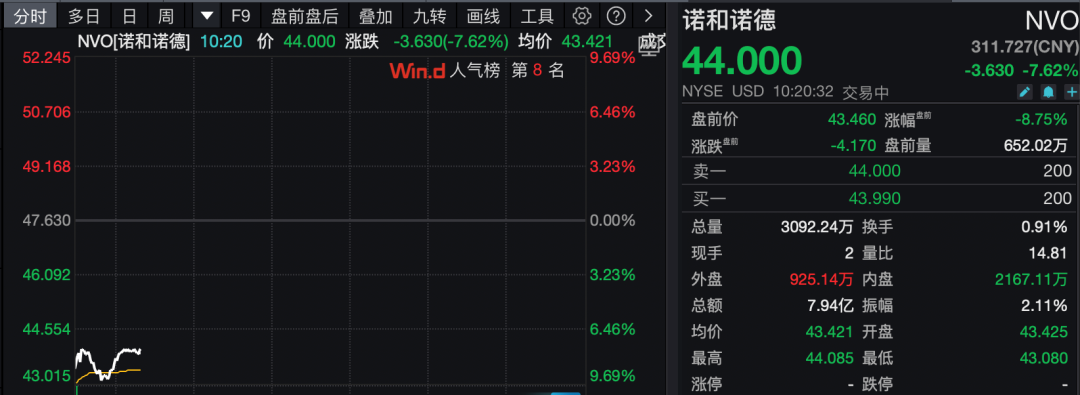 诺和诺德跌近8%。消息面上,诺和诺德公布了司美格鲁肽针对阿尔茨海默病的晚期试验结果,两项大规模临床试验数据显示,使用司美格鲁肽治疗早期阿尔茨海默病未见显著疗效,数千名参与研究的患者均未出现明显改善。