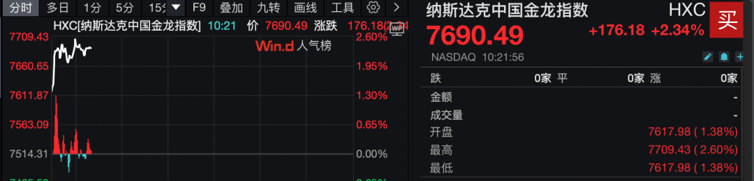 中国资产全线爆发。纳斯达克中国金龙指数涨超2%。