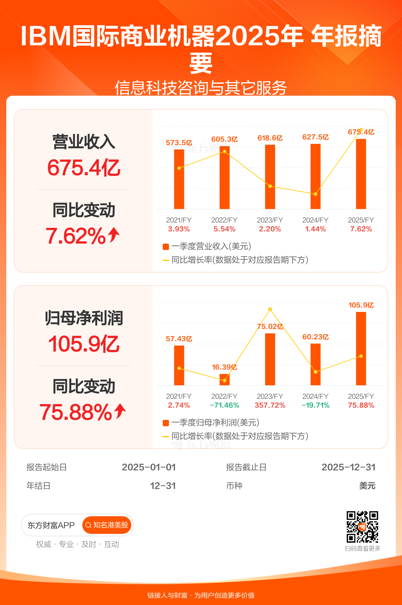 IBM国际商业机器1月28日发布年报业绩,截至2025年12月31日的12个月内,该公司营业收入675.35亿美元,同比增长7.62%;公司权益持有人应占溢利(归母净利润)105.93亿美元,同比增长75.88%。