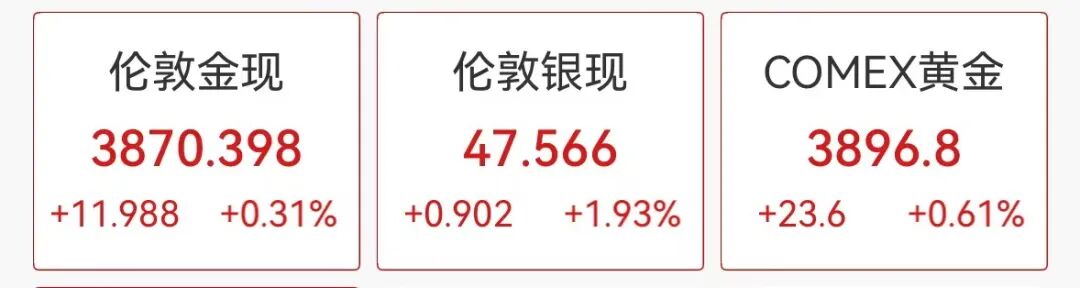 现货黄金涨幅收窄,最新报3870.398美元/盎司,日内曾一度站上3895美元关口。现货白银涨幅扩大近2%,报47.566美元/盎司。