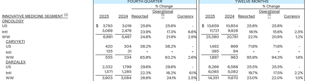 强生的创新制药业务可分为六大板块,包括肿瘤、自身免疫、神经科学、肺动脉高压、感染、心血管及代谢等,其中肿瘤业务的Carvykti(西达基奥仑赛)。2025年收入达到18.87亿美元,同比增长95.9%。