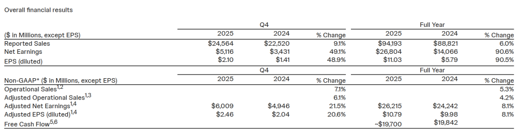 当地时间1月21日,美国强生公司公布2025年四季报以及全年财报。2025年第四季度收入245.64亿美元,同比增长9.1%,净利润51.16亿美元,同比增长49.1%。全年来看,收入达到941.93亿美元,同比增长6%,净利润268.04亿美元,同比增长90.6%,调整后净利润262.15亿美元,同比增长8.1%。
