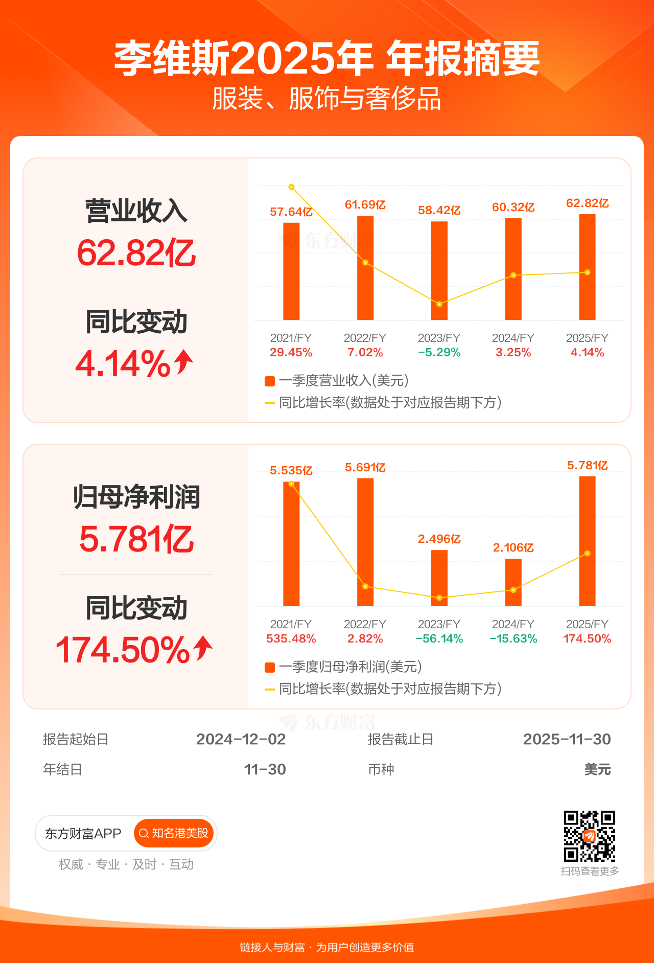 李维斯1月28日发布年报业绩,截至2025年11月30日的12个月内,该公司营业收入62.82亿美元,同比增长4.14%;公司权益持有人应占溢利(归母净利润)5.78亿美元,同比增长174.50%。