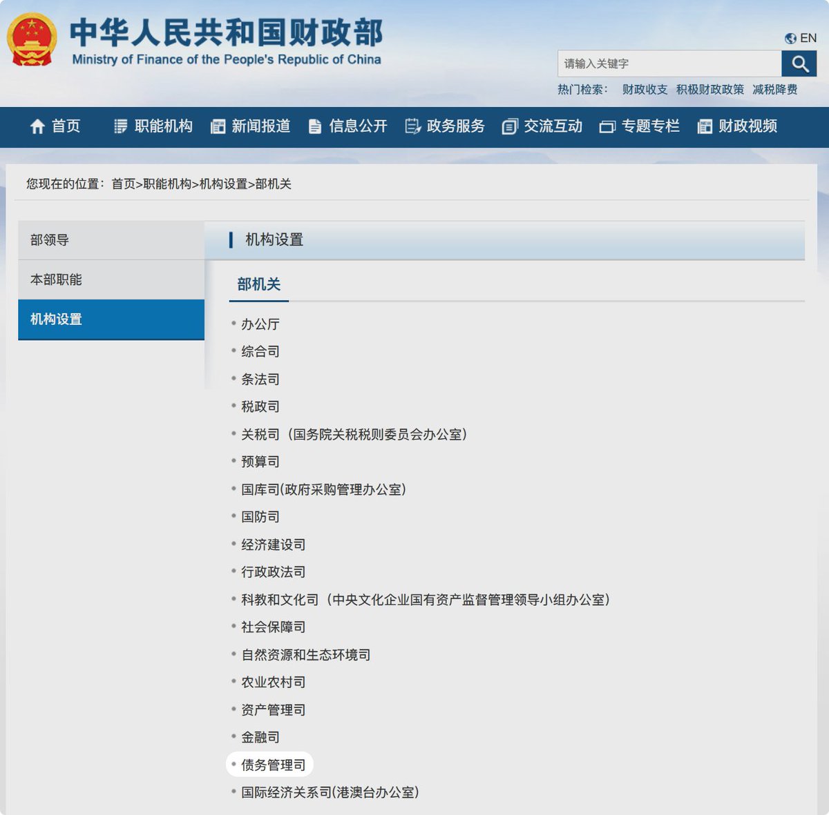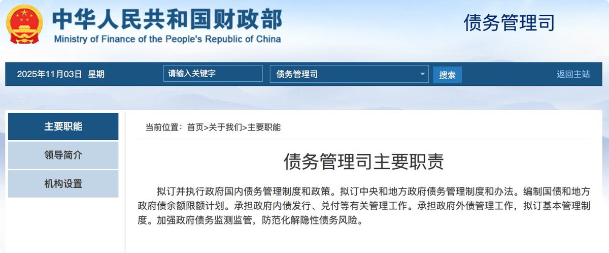 中国财政部官网“机构设置”栏目更新信息,财政部债务管理司已列入“部机关”列表。债务管理司主要职责包括:拟订并执行政府国内债务管理制度和政策。拟订中央和地方政府债务管理制度和办法。