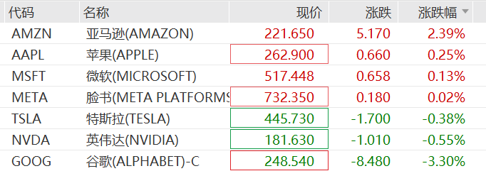 科技七巨头指数跌0.42%,其中亚马逊以2.39%领涨,谷歌以3.3%领跌。苹果维持涨势,截至发稿涨0.25%,续创新高。