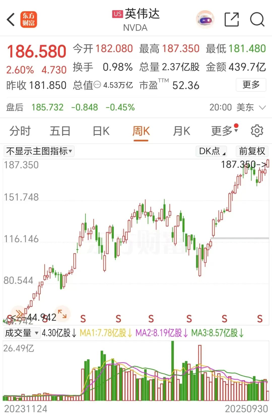 AI硬件“总龙头”英伟达股价再创历史新高,市值突破4.5万亿美元,盘中股价最高触及187.35美元。