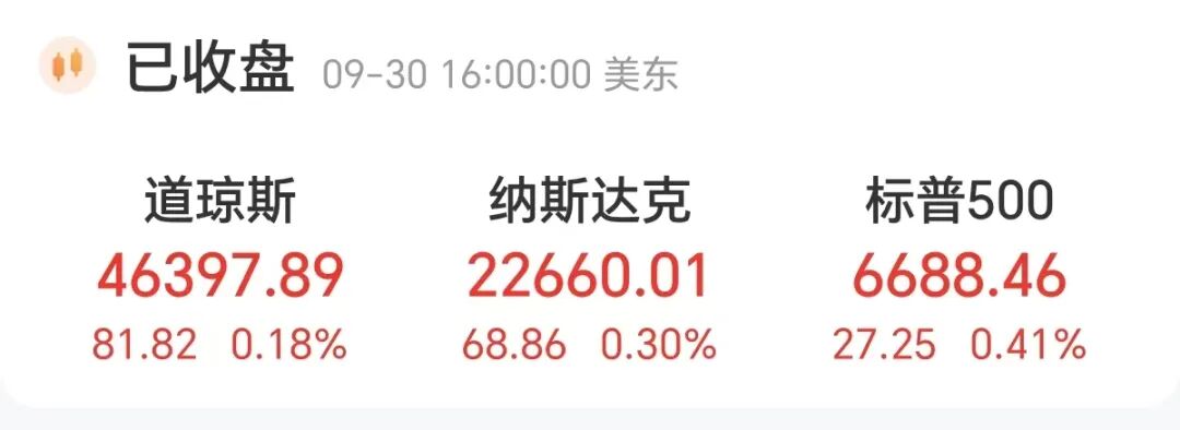 当地时间周二(9月30日)美股三大指数在震荡中收高。截至收盘,道琼斯工业平均指数涨0.18%,报46397.89点;标普500指数涨0.41%,报6688.46点;纳斯达克综合指数涨0.3%,报22660.01点。