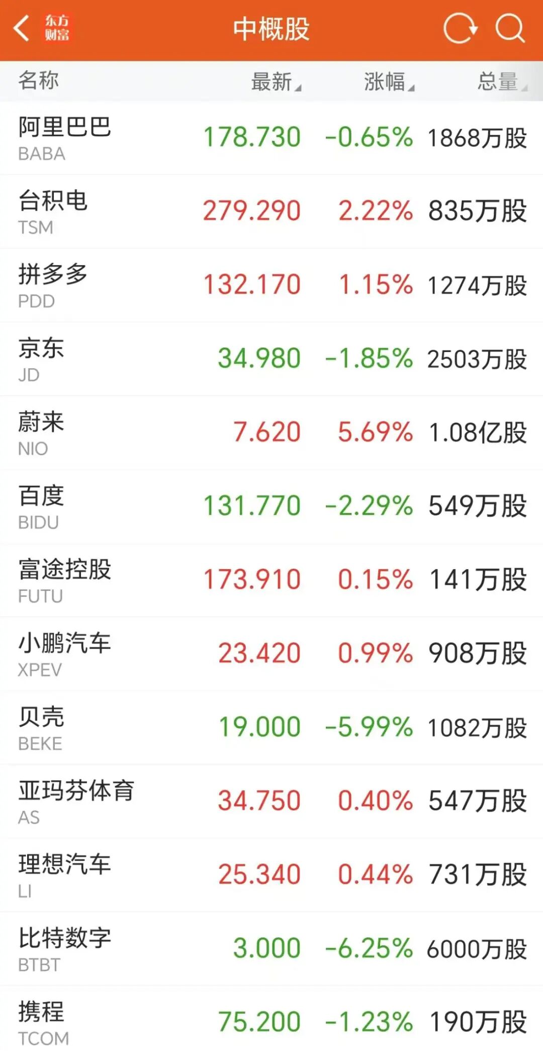 中概股表现分化,纳斯达克中国金龙指数跌0.42%。阿里巴巴跌0.65%,京东跌近2%;蔚来涨近6%,拼多多涨超1%,小鹏汽车涨近1%。