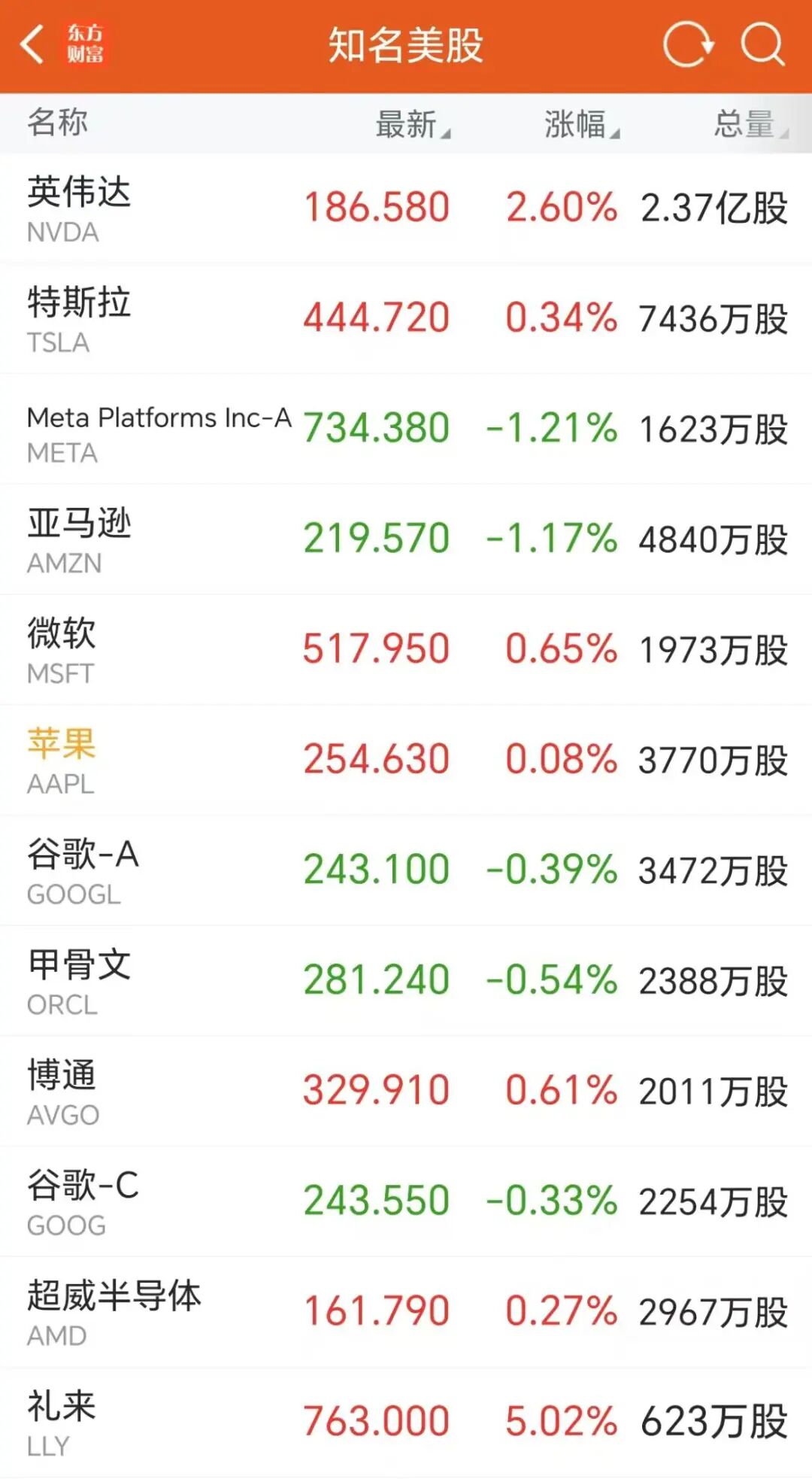 大型科技股涨跌互现,英伟达上涨2.59%,再创历史新高,市值突破4.5万亿美元。微软涨0.65%,特斯拉涨0.34%,苹果涨0.08%;谷歌跌0.39%,亚马逊跌1.17%,Meta跌1.21%。