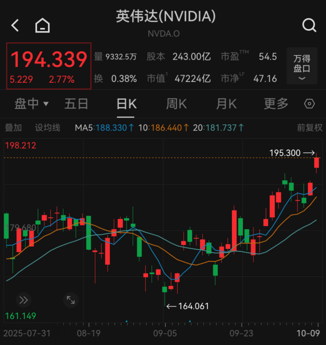 北京时间10月9日晚间,英伟达大涨,盘初涨幅一度超3%,最高触及195.3美元/股,股价再创新高。今年以来,英伟达累计涨幅超40%。