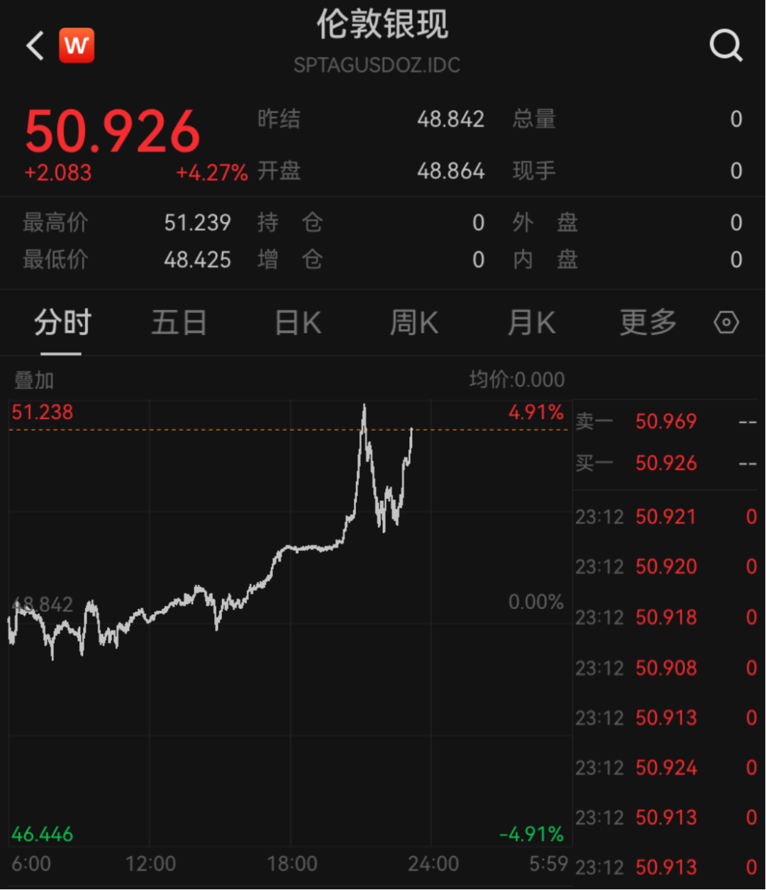 贵金属方面,现货白银价格盘中直线拉升,历史上首次突破51美元/盎司,涨幅一度接近5%。截至发稿时,现货白银价格仍于50美元/盎司上方高位震荡。