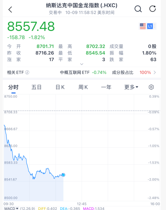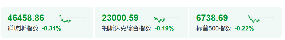 10月9日晚间,美股三大指数回落,道指跌超100点,纳指、标普500指数跌约0.2%。