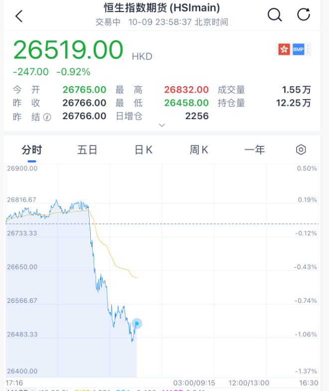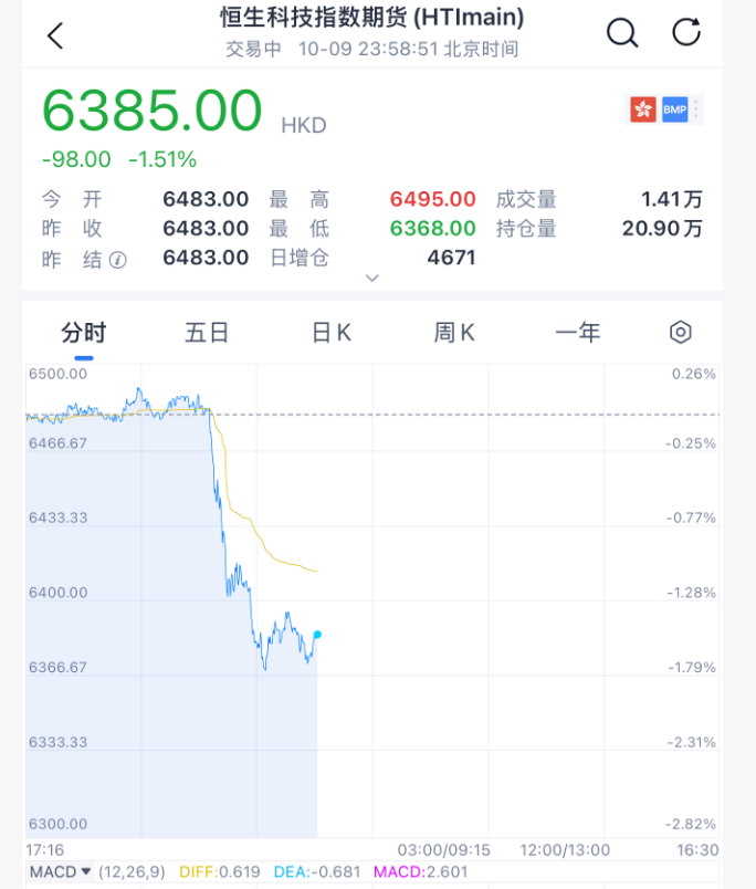 中国资产方面,中概股指数跌近2%;而港股夜盘同步跳水,恒生指数期货跌约1%,恒生科技指数期货跌1.51%。