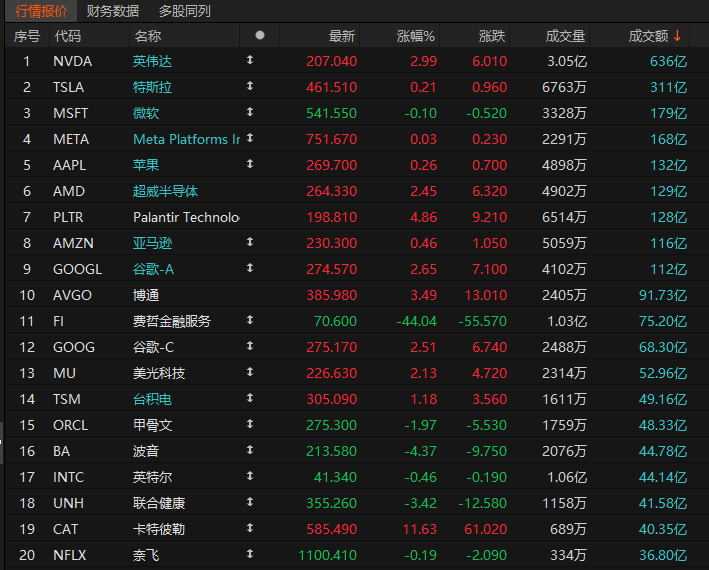 周三美股成交额第1名英伟达收高3.05%,股价再创历史新高,成交636亿美元,市值突破5万亿美元,成为全球首家市值达到这一里程碑的公司。该公司市值突破4万亿美元是在今年7月9日。