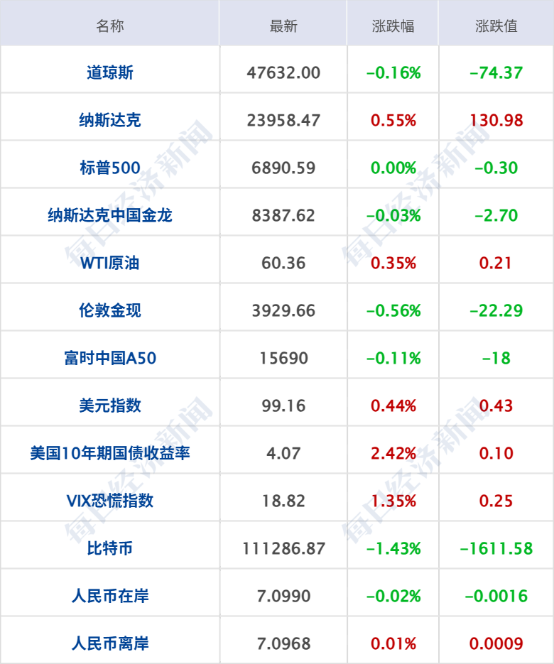美股三大指数收盘涨跌不一,纳指涨0.55%,标普500指数平收,道指跌0.16%;英伟达涨约3%,总市值站上5万亿美元大关,这也是首家市值突破5万亿美元的上市公司;苹果小幅上涨,首次收盘总市值超4万亿美元;谷歌涨超2%,续创新高;亚马逊、Meta、特斯拉小幅上涨;英特尔、微软、奈飞小幅下跌;卡特彼勒涨12%,创2009年以来最大单日涨幅。纳斯达克中国金龙指数基本平收,中概股涨跌不一,小马智行跌超3%,爱回收跌超2%,理想汽车跌1.64%;阿里巴巴涨近2%,哔哩哔哩涨超1%。