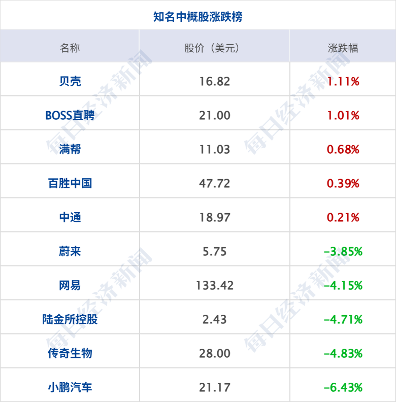 美股三大指数集体收涨,道琼斯指数涨0.10%,标普500指数涨0.38%,纳斯达克综合指数涨0.59%;大型科技股涨跌互现,英伟达涨近3%,市值暴增1254亿美元(约合人民币8917亿元),谷歌、甲骨文、英特尔涨超2%,奈飞跌超3%,AMD跌超2%,微软、Meta跌超1%。中概股多数下跌,纳斯达克中国金龙指数跌1.53%;小鹏汽车跌超6%,网易跌超4%,蔚来、哔哩哔哩、理想汽车跌超3%,京东、百度跌超1%。