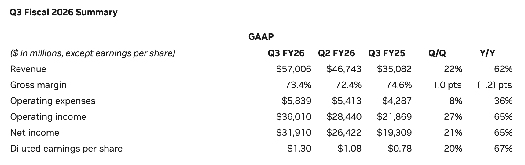 美东时间11月19日周三美股盘后,英伟达公布了2026财年第三季度的财报。财报显示,英伟达第三财季营收为570.1亿美元,超出市场预期的549.2亿美元,环比增长22%,同比增长62%。净利润为319.1亿美元,同比大涨65%,经调整后的每股收益为1.30 美元,高于市场预期的1.25美元。毛利率73.4%,同比稍有下跌1.2个百分点。