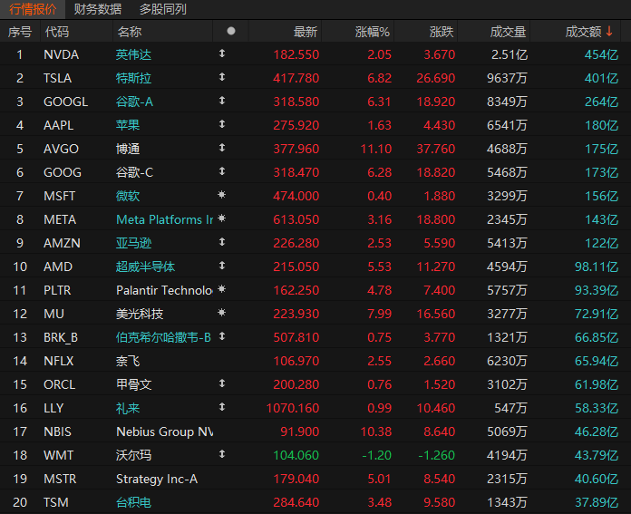 第3名谷歌A类股(GOOGL)收高6.31%,股价创历史新高,成交264亿美元。该股股价飙升标志着市场对Alphabet公司的情绪出现显著逆转。2022年ChatGPT推出后,尽管Alphabet公司是生成式人工智能底层技术的主要发明者之一,但部分投资者曾担忧该公司已将人工智能领域的优势拱手让给OpenAI。