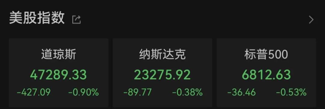 截至收盘,道指跌427.09点,跌幅为0.90%,报47289.33点;纳指跌89.77点,跌幅为0.38%,报23275.92点;标普500指数跌36.46点,跌幅为0.53%,报6812.63点。