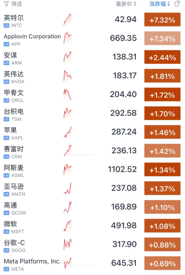 与人工智能交易相关的科技股同样对大盘构成支撑,甲骨文等个股扭转了上一交易日的跌势。AI芯片龙头英伟达上涨近2%。