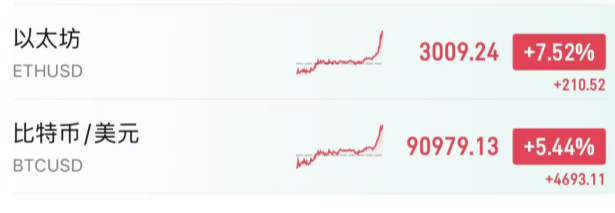 比特币暴涨超5%,升至9万美元上方,收复了前一交易日部分跌幅。以太坊暴涨超7%。