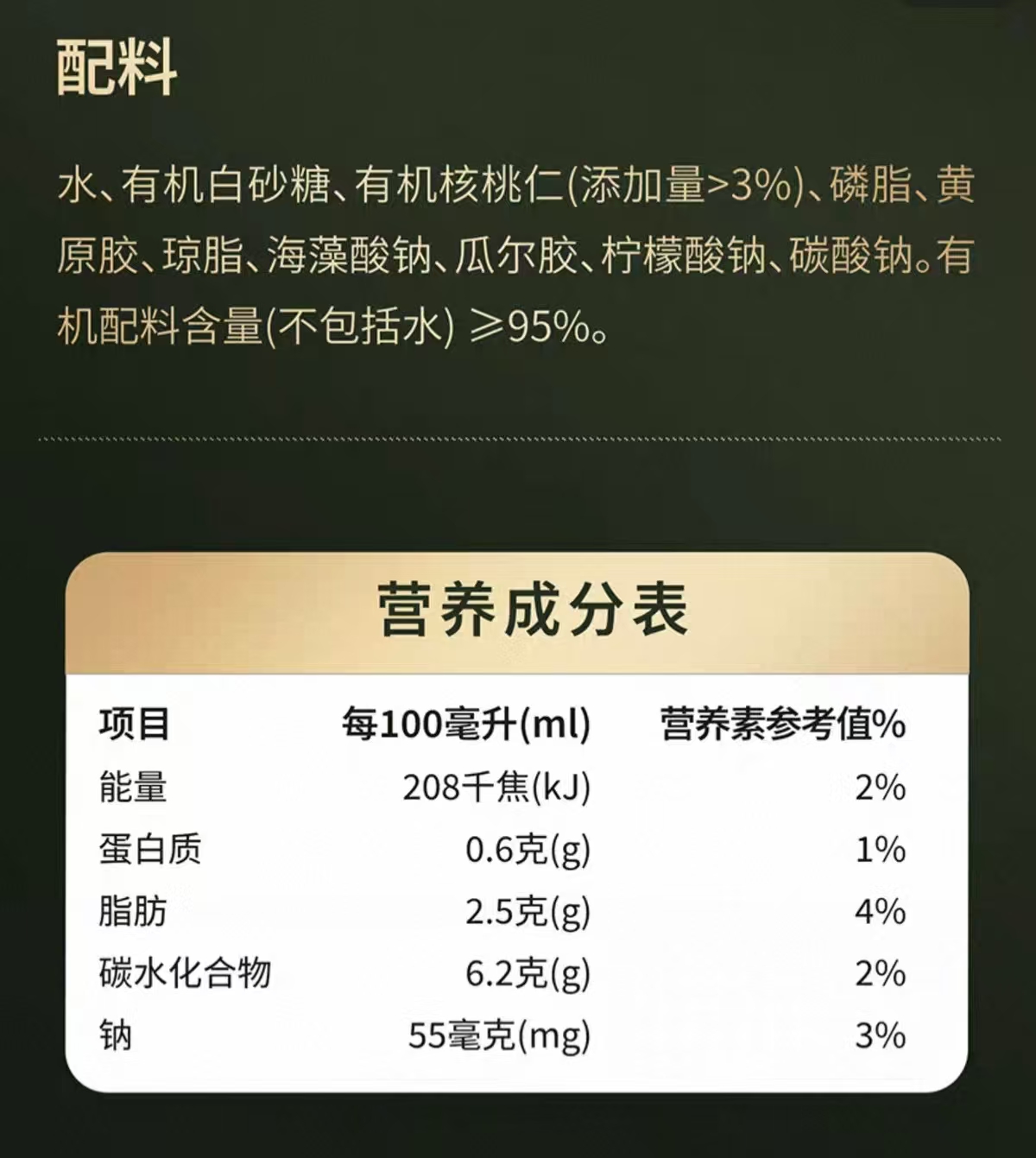 上述宣称“营养之选核桃仁,≈4.6倍牛奶蛋白质含量”的三只松鼠甄养有机核桃乳,实际蛋白质含量仅为0.6g/100mL。如果按一瓶牛奶250毫升、每100毫升含有2.9克蛋白质计算,则需饮用5瓶同规格的三只松鼠甄养有机核桃乳,才能达到一瓶牛奶的蛋白质含量。仔细查看产品页面可以发现,其“4.6倍牛奶蛋白质含量”下方配有小字号注解:“根据《中国食物成分表(标准版)》第6版第二册,100g核桃的蛋白质含量为15.3g,100g牛奶蛋白质含量3.3g”,而非产品中蛋白质的实际含量。