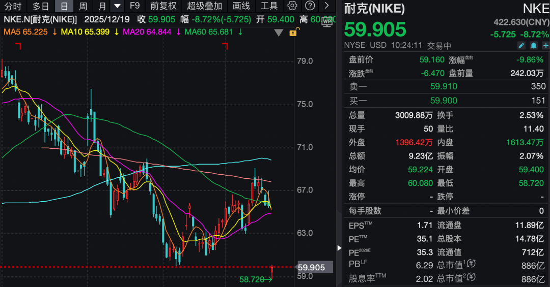 耐克盘中跌近9%。消息面上,12月18日,耐克公布了截至2025年11月30日的2026财年第二季度财报。数据显示,公司当季营收达124亿美元,按报告口径同比增长1%,剔除汇率影响后与上年同期持平。尽管整体营收实现温和增长,但净利润降至8亿美元,同比下降32%;每股收益0.53美元,低于上年同期的0.78美元。