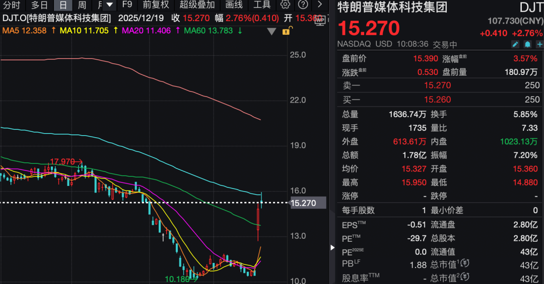 特朗普媒体科技集团一度涨近7%,截至发稿涨幅收窄至约3%。当地时间12月18日,特朗普媒体科技集团发布公告称与一家获得Alphabet支持的核聚变能源公司TAE Technologies签署最终合并协议,双方将通过全部股票交易合并,交易总价值超过60亿美元。交易完成后,两家公司股东将各自拥有合并后公司约50%的股份。
