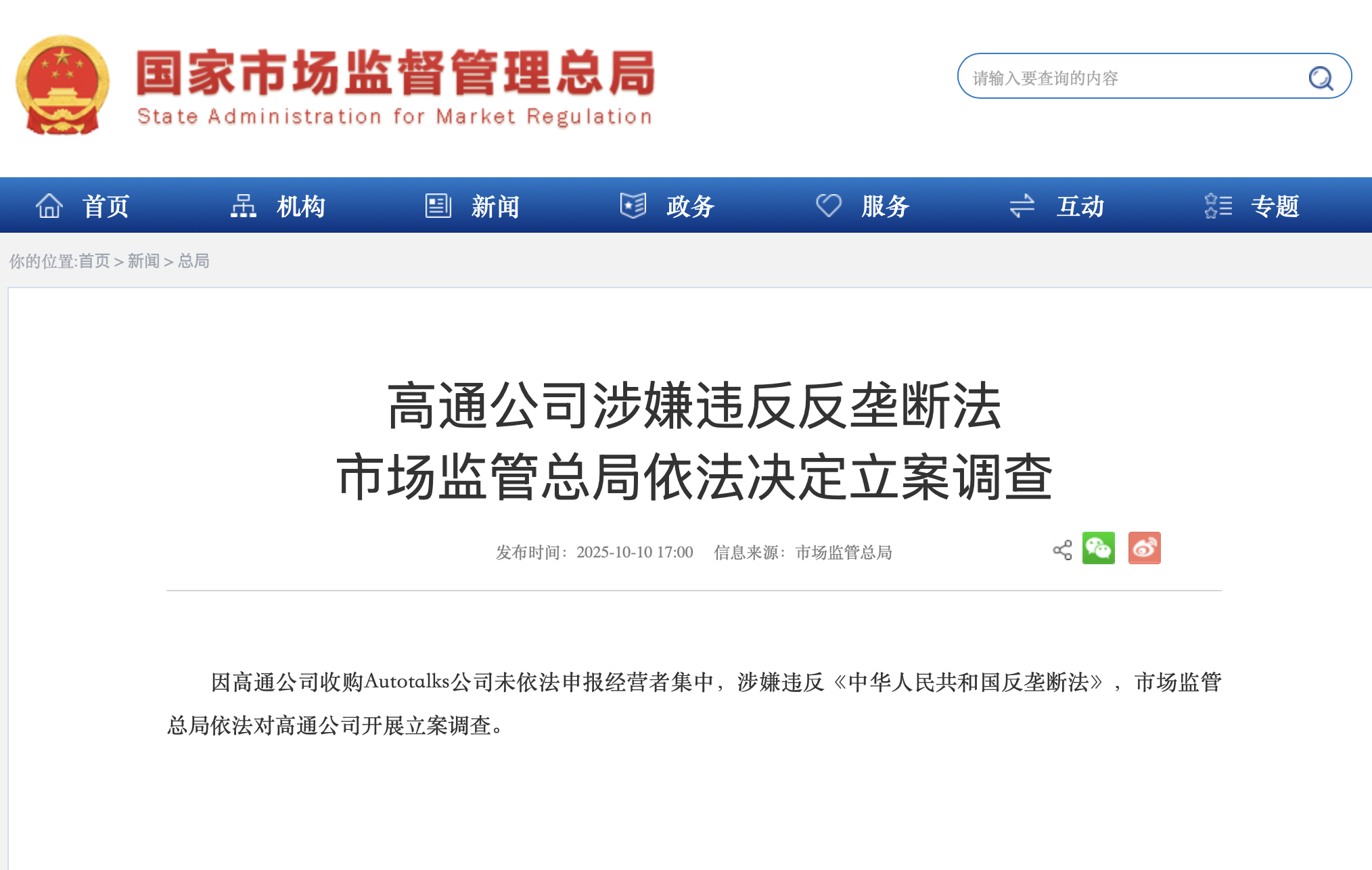 10月10日,据国家市场监督管理总局官网消息,因高通公司收购Autotalks公司未依法申报经营者集中,涉嫌违反《中华人民共和国反垄断法》,市场监管总局依法对高通公司开展立案调查。